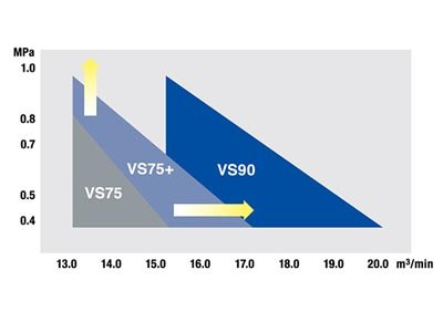 The selection of the optimum airend and the direct gear structure with the motor realize high air volume, and at low pressure setting, the wide range control function covers the air volume range of machines one size larger. The optimal model can be selected for your low-pressure needs.